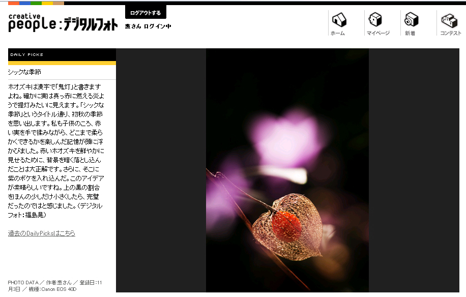「dcp1(一般部門)」に入選したのに「dcp2(入門部門)に入選」とメールが来て、直後に訂正メールが来るのもやっぱり福島さんです。私はもう慣れました。そんなオチャメな福島さん、毎度微笑ましく眺めております。